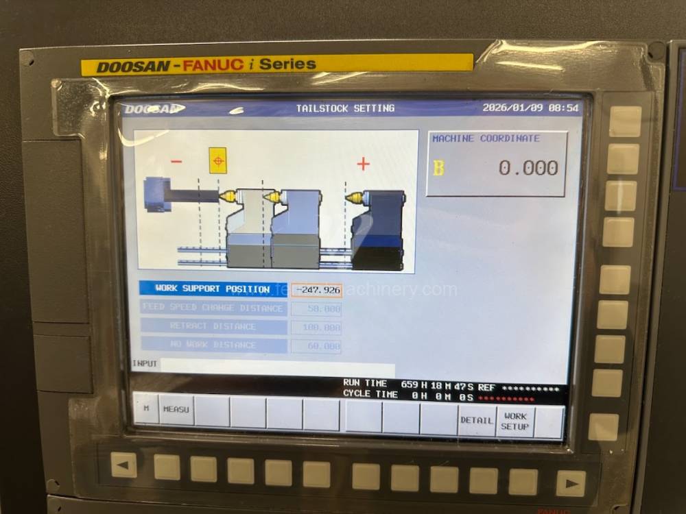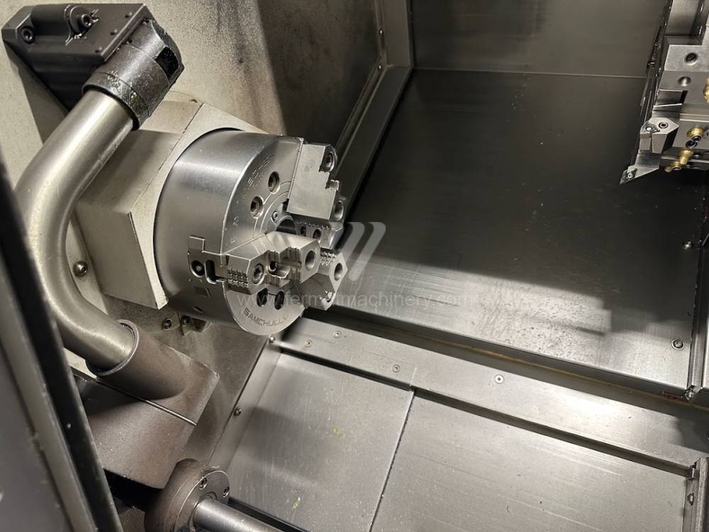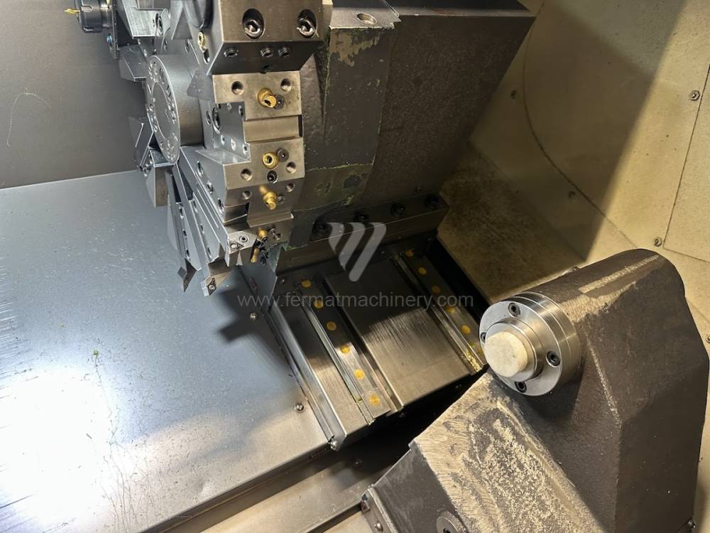 The machine is in excellent technical condition and can be tested. Accessories / Features: programmable tailstock (B-axis), Renishaw tool probe, chip conveyor, oil mist extractor, tool holders (4 internal/boring, 4 external), parts catcher, bar feeder preparation, tool load monitoring system, high-pressure coolant system (7 bar), chuck + jaws, documentation. Spindle hours: approx. 6,300 hours